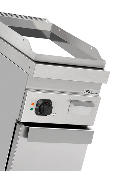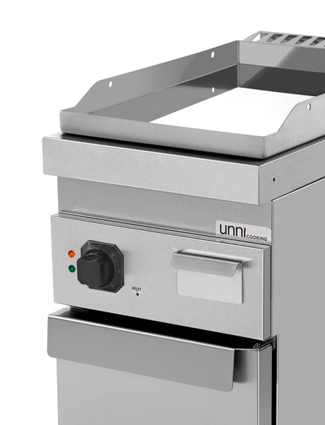 Floor-standing electric griddle (Series 700) with 1 independently adjustable heating zone.Closed base, stainless steel smooth / chrome griddle plate (380 × 565 mm).Height-adjustable feet (850–900 mm).Safety thermostat and heating indicator light.Power: 400 V, 50 Hz, 3 NAC, 4.5 kW.Dimensions: 400 × 700 × 850 mm.