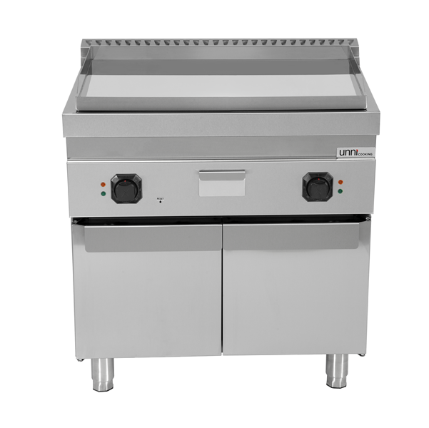 Floor-standing electric griddle (Series 700) with 2 independently adjustable heating zones.Closed base, stainless steel smooth / chrome griddle plate (740 × 565 mm).Height-adjustable feet (850–900 mm).Safety thermostat and heating indicator light.Power: 400 V, 50 Hz, 3 NAC, 9 kW.Dimensions: 800 × 700 × 850 mm.
