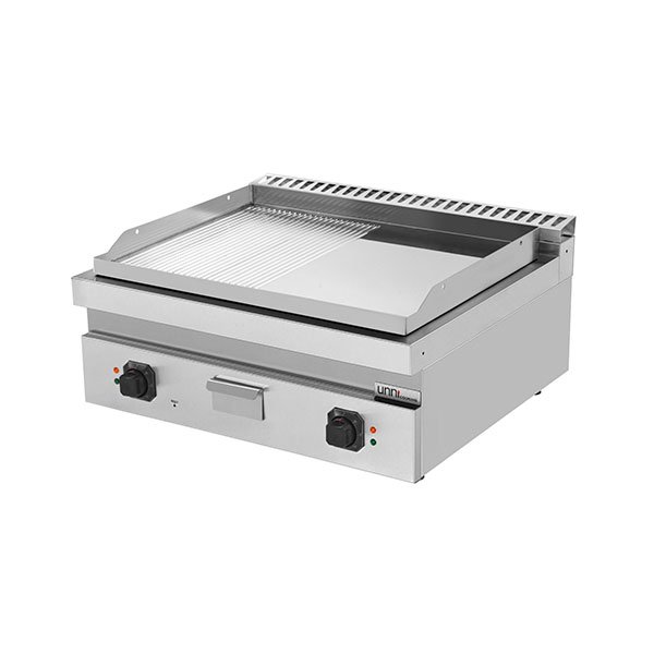 Countertop electric griddle (Series 700) with 2 independently adjustable heating zones.Smooth griddle plate (740 × 565 mm).Safety thermostat and heating indicator light.Power: 400 V, 50 Hz, 3 NAC, 9 kW.Dimensions: 800 × 700 × 350 mm.