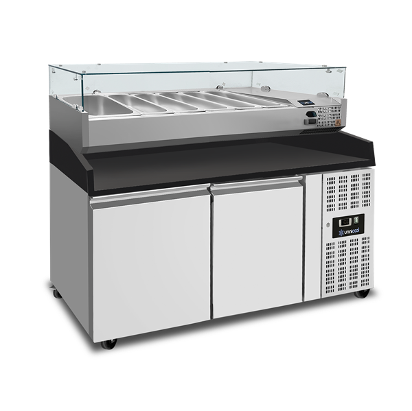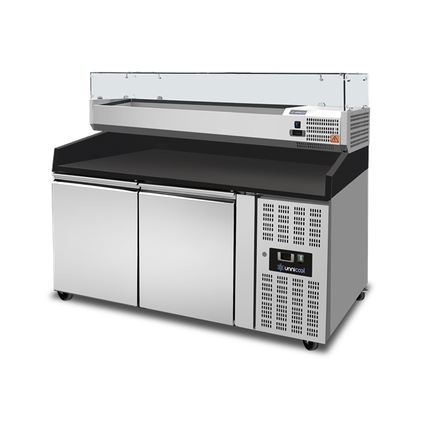 Pizza Counter 2 Doors – 151x80x100cm – BLACK Granit Dimensions (W x D x H): 1510 x 800 x 1000 mm Net Capacity: 390 liters Temperature Range: +2°C to +8°C Price is Without refrigerated counter