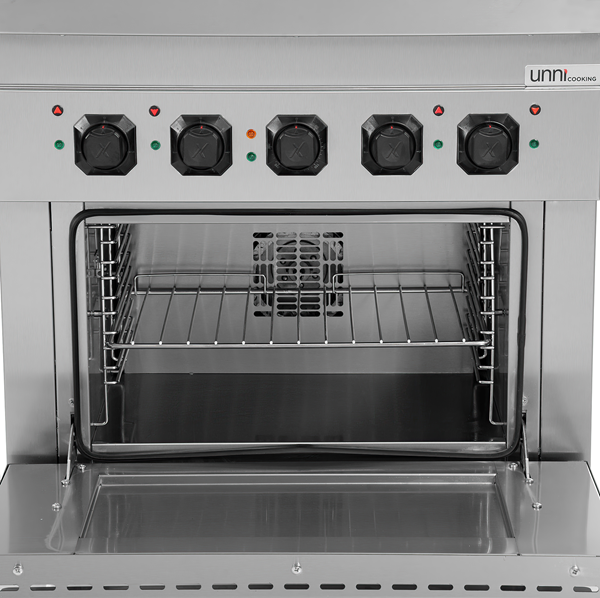 This electric upright cooking unit from the 700 series combines a powerful 4-zone cast iron hob with a convection oven.The multifunctional oven offers a temperature range of 100–300 °C and is compatible with 1/1 GN trays.Each cooking zone delivers 2.6 kW for reliable and even heat performance.The stainless steel construction ensures durability and easy cleaning in professional kitchens.Designed for intensive daily use, this unit is ideal for restaurants and catering operations.